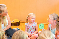 Die spielerische Umsetzung von Sprache wie z.B. beim Singen, Vorlesen und in diversen Sprachspielen spielt dabei eine große Rolle und fördert den Wortschatz der Kinder maßgeblich. Zudem werden die Kinder in Ritualen, wie etwa dem Morgenkreis und der Verabschiedung, regelmäßig zum Sprechen ermuntert. Die alltagsintegrierte Sprachförderung findet dabei in jedem Bereich und bei alltäglichen Aktivitäten, wie z.B. den hauswirtschaftlichen Tätigkeiten, dem Basteln oder auch beim Turnen statt. Unsere Mitarbeiter sind sich dabei ihrer Vorbildfunktion bewusst und schaffen Situationen und Anlässe, die sich immer nach Alter und Entwicklungsstand des Kindes richten. Dabei werden sie durch den gezielten Einsatz von Medien, wie z.B. Tonträgern, Büchern und anderen digitalen Medien unterstützt.